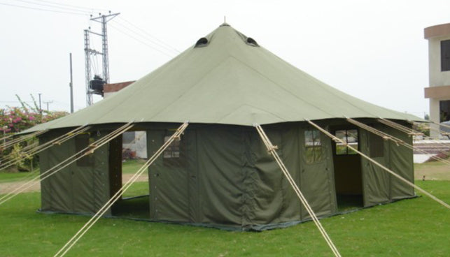 Tent: 450 GSM (+/-5%) 100% Cotton Canvas, Water & ROT Resistant, available in Olive Green, Khaki or any color Option A: Outer Fly made of 450 GSM (+/-5%) 100% Cotton Canvas, Water & ROT Resistant Fabric Option B: Optional Fire Retardant Finish in Tent Fabric Ground Sheet & Mud Flap: 180 GSM (+/-5%) PE Optional: Ground Sheet can be replaced with 400 GSM (+/-5%) PVC Coated Fabric on both sides |